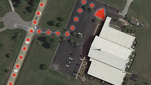 Cars line up on the north side of our parking lot (see arrow). Each person will receive a list of available items to choose from. This includes staples, fresh food, and meat!